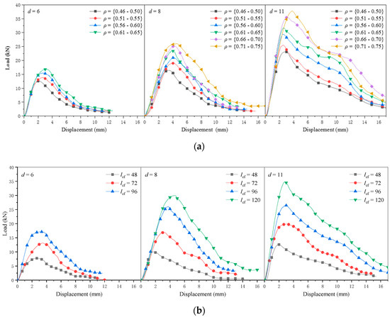 Figure 3 shows the typical load-displacement behaviours of density and effective length varieties for the three types of STS under withdrawal tests. The load-displacement curves of withdrawal tests almost had a similar trend, with a linear increase before abrupt failure. The similar feature has been found in the withdrawal test of timber and glued-laminated timber [12]. In the same effective length group, lef = 96 mm, the maximum load increased with the increasing diameter and the increasing density (Figure 3a). In the same density group, ρ12, mean = {0.56–0.60} g/cm3, the maximum load increased with the increasing diameter and the increasing effective length (Figure 3b).