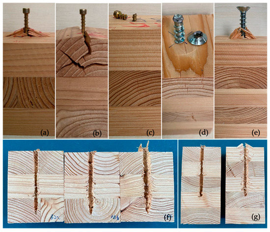 Typical failure patterns of withdrawal test for STS and CLT, such as row shear of CLT surrounding STS (a,e,f,g), splitting and tension cracks perpendicular to grain of CLT in the first layer (b), and steel tension failure of STS (c,d).