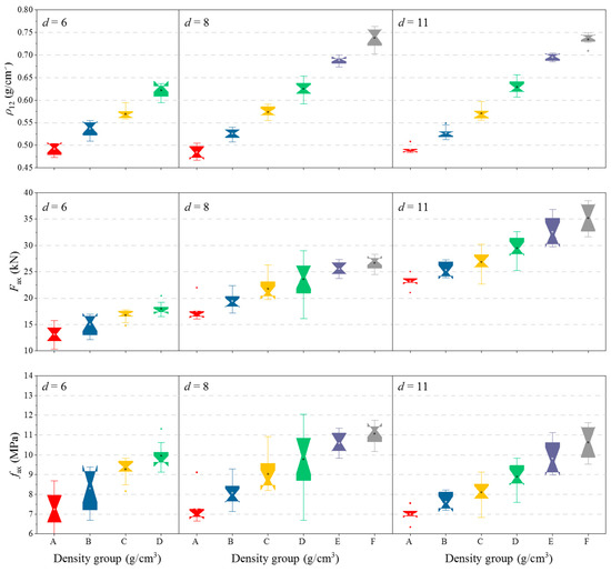 The withdrawal strength shown in Table 4 and Figure 5 (below) has a significant increase with increasing density, but a slight decrease with increasing diameter. The same observation was reported by Hübner [33], who tested the axial withdrawal capacity of self-tapping screws with diameters of 6 mm, 8 mm, 10 mm, and 12 mm in hardwoods. Overall, the CV of the withdraw strength of all the tested groups is low due to the control of the experimental design. The mean values of withdrawal strength decrease by an average of 1.8% with the increase in screw diameter from d = 6 mm to d = 8 mm, and further decrease by an average of 6.5% from d = 8 mm to d = 11 mm. When the density increased by 0.05 g/cm3, the withdrawal strength increased by an average of 9.4%. In addition, the larger the diameter, the more obvious the effect.