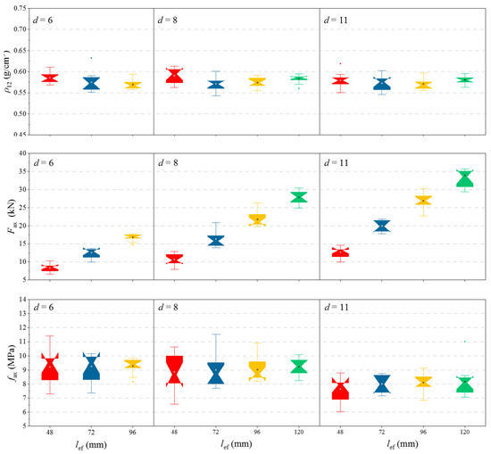 The box-plots of withdrawal capacity for each group are presented in Figure 5 (middle). An increase in withdrawal capacity with increasing diameter and density can be observed. This agrees well with current design equations that the withdraw capacity is a function of diameter and density in EN 1995-1-1 and in technical approvals for STS [34]. Compared with density, the diameter has a more significant influence on withdrawal capacity [28].