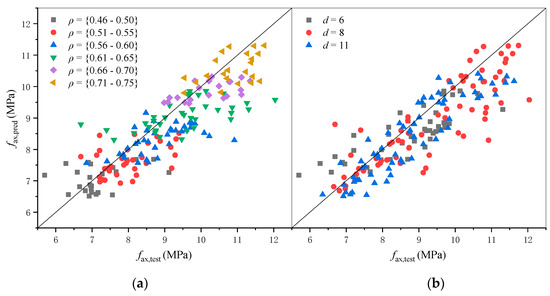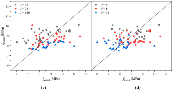 The verification of this model, as a comparison between test values and predicted values for withdrawal strength of different levels on density, effective length, and diameter is shown in Figure 7. As expected, overall, a better prediction was observed. The model fit very well for CLT with lower density, and the predicted values were a little conservative for CLT with higher density (Figure 7). For configurations with the same density group and different effective length, though the data were slightly scattered, the model fit well (Figure 7).
