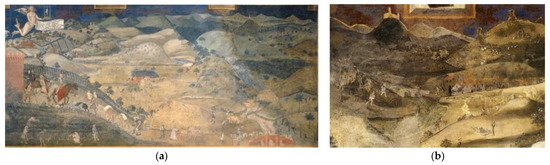 In Italy, forests currently occupy about 39% of the total surface, while Tuscany is one of the first two regions in terms of surface occupied by forests, covering about 1,163,057 ha, equal to 50.6% of the regional territory []. Tuscany is the fifth Italian region in terms of extension, with 67% of the territory classified as hills, 25% as mountains (mostly in the Apennine range) and only 8% as plains []. The 93% of the regional territory is classified as rural, while 44% of the population (3,753,000 people) lives in 11% of the territory characterized by intensive landscapes []. Tuscany has also a long history, with the first stable settlements dating back long before the Roman Empire, of interactions between forests and humans. Etruscans, and afterward the Romans, began not only to exploit forests but also to manage them with a strong integration between agriculture and forests, modifying their natural features. With a few centuries of interruption during the barbaric invasions (5th–8th century) when there was an abandonment of agriculture, this close relation between humans and forests continued over the centuries. The idea of a cultural landscape was already in the mind of governors of Tuscany in the middle ages, as demonstrated by the famous frescos painted by Ambrogio Lorenzetti in Siena for the government of the city in 1338. These frescos in fact depict both “the wise management of the territory”, showing a harmonious landscape entirely managed, and the “bad management of the territory”, with a landscape characterized by destructions due to wars and rewilding (Figure 1). The landscape represented in the first fresco is also the image that made Tuscany famous, from the middle ages to nowadays, described by hundreds of travelers of the so called “Grand Tour”, traveling from the north of Europe to Italy.