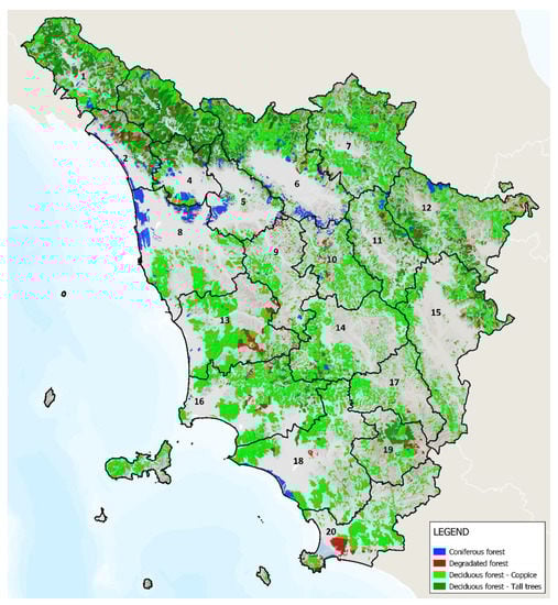 The Forest Map of the Kingdom of Italy of 1936, the first one for forests made after the Unity of Italy, was recently digitized and made available by the Italian Forestry Service both in raster format, as the result of the scanning and georeferencing of the original sheets, and in vector format. The last is the one used for this research. The information contained in the document covers the entire Italian territory in 1936, and it was necessary to extract the information about Tuscany. The map describes the forests according to different classes mainly based on a wood production perspective, identifying different physiognomic categories, with sub-categories related to the form of management or, in the case of resinous trees, related to the presence of the different species. The legend of 1936 Forest Map for the Tuscan region was made of six different classes based on the prevailing forest tree species. To make it comparable with the 2016 land use map, which does not provide information about the species, the 1936 classes have been merged and reclassified into three macro-categories (Table 1). Among the original categories, the one called “degraded woods” does not have a clear definition, and it can refer to different types of forest surface, such as the Mediterranean maquis, or areas degraded by fires or bad management (overloaded pastures), or shrublands which could be candidates for reforestation []. Regarding the “forests with other species or mixed forests” 1936 type, it has been decided to reclassify it into the “broadleaved forests” type, as the 1936 forest map highlighted that the 96.4% of this class was managed as coppice, therefore they must necessarily have been broadleaved woods.