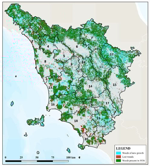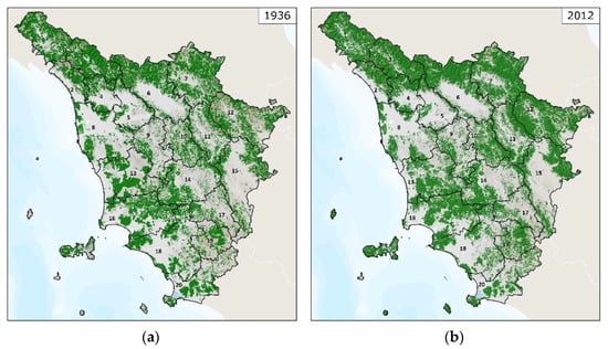 The first step of the research focused on finding historical documents, especially the historical and recent cartography related to forests. For the period before 1936, the first Italian forest inventory of 1870 [] and the study called “La Toscana Agricola” printed in 1881 [] reporting the data from the first investigation on agriculture of Italy, have been analyzed. These documents provide information on the features and management of the forests, but without details on the territorial distribution. There are also other historical information existing for the previous period, demonstrating the intense management affecting all the forests of Tuscany in history, but the data are not so reliable []. The main historical and cartographic source that has been used is the Forest Map of the Kingdom of Italy of 1936, which has been compared to the most recent cartographic source, the official Land Use Map of 2016 of the Tuscan Region.