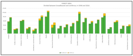 Conifer and broadleaved forests in 1936 and 2016 for each landscape unit. Conifer forests have almost everywhere increased as a consequence of direct afforestation carried out during the last century.