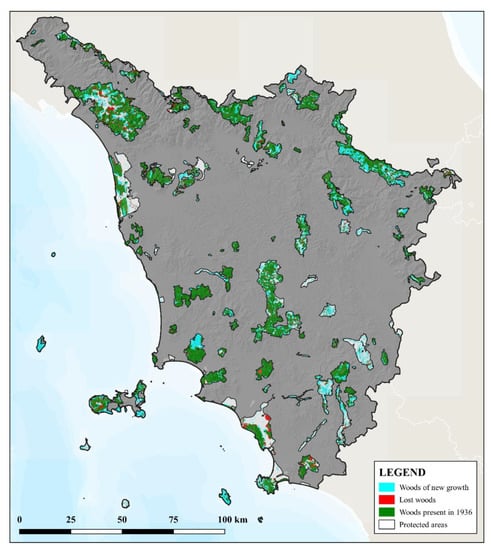 Results demonstrates that the current characteristics of most of the forests of Tuscany are the result of traditional practices carried out for centuries, affecting extension, density, structure and species composition. They are basically cultural forests, shaped by humans, including those in protected areas. The comparison between the digitized map of 1936 and the land uses system of the year 2016, shows that almost one third of the present forest area is the result of secondary successional forests, a consequence of the abandonment of cultivations and pastures or of coppice management occurred in the last decades. This demonstrates that, as for Italy and several European countries, there are no deforestation processes occurring, but an extended reforestation due to the abandonment of agricultural land, causing a degradation of landscape quality, the growing import of food contributing to the increase of the ecological footprint, and altering the balance and distribution of the different land uses. The deforestation occurred in the last hundred years in Italy is mainly located around urban areas developed in the plains, while reforestation has affected mountain and hills following different models explained in this paper.