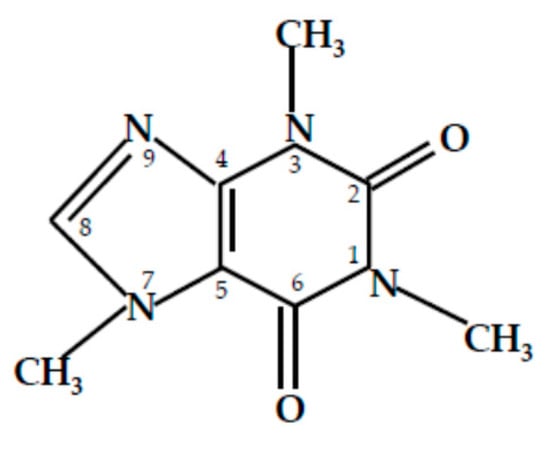 Caffeine (C) (1,3,7-trimethyl-3,7-dihydro-1H-purin-2,6-dion) appears to be a suitable candidate for wood protection against biological attacks [11,12,13,14,15,16,17,18,19,20,21]. This methylxanthine (Figure 1) is produced by coffee tree or the plants such as legumes and certain types of vegetables. It was also tested as an active substance against termites [11]. Other authors [12,13,14,15,16] have analyzed he effectiveness of tea extracts or pure caffeine against fungi or molds in vitro studies. Pure caffeine was also applied to wood materials under various concentrations and treatment conditions [17,18,19]. Caffeine in various mixtures has already been tested [9,20,21].