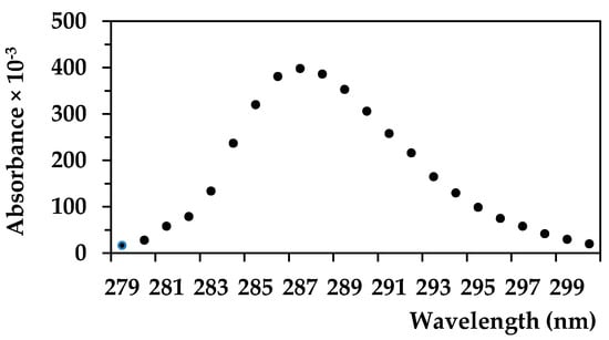 The suspension of cellulose (with or without caffeine) was filtered to obtain 5 mL of the filtrate. Determination of all solutions with or without caffeine (5 mL) was performed using UV–VIS spectrometry (spectrophotometer Biochrom Libra S22) at the optimal wavelength for the determination of caffeine (Figure 1). A 1 g/L caffeine concentration was used for this experiment [14,15]. A linear calibration curve was then generated with caffeine concentrations ranging from 1 to 10 mg/L as we only prepared 25 mL of caffeine solution (max. 25 mg of caffeine per test bottle), and we accepted any caffeine affinity to the individual wood components (see Figure 2 in the Results and Discussion chapter).