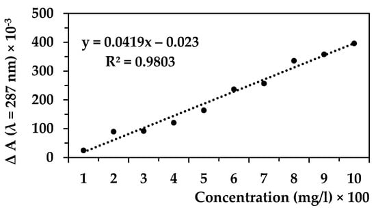 Calibration curve of caffeine in the range 1–10 mg/L (wavelength 287 nm).