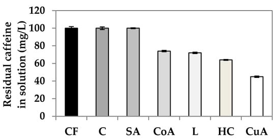 Residual levels of pure solution of caffeine (CF) (1 g/L) or in the aquatic mixtures of caffeine (1 g of caffeine and 1 g of each wood component·L−1) with the selected components of wood: cellulose—C, sinapyl alcohol—SA, conipheryl alcohol—CoA, lignin—L, hemicellulose—HC, coumaryl alcohol—CuA. The results were statistically determined using ANOVA, Dunnett Multiple Comparison Test; see Tables S1–S3.