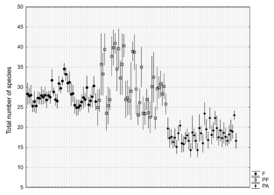Total number (mean ± 95% confidence interval based on 10 research plots of 100 m2) of plant species in natural forests (F), manor parks adjacent to forests (PF), and manor parks not adjacent to forests (PA).