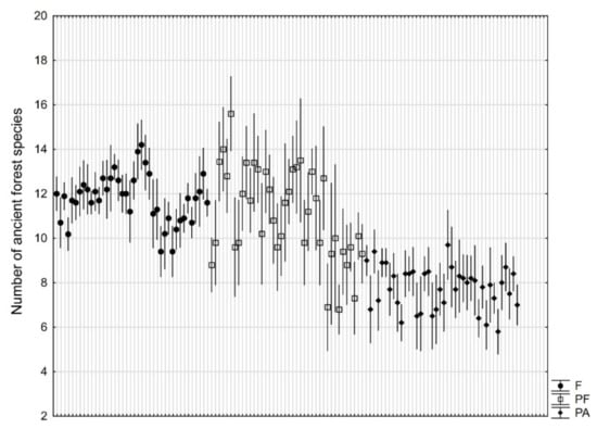 Number (mean ± 95% confidence interval based on 10 research plots of 100 m2) of ancient forest species in natural forests (F), manor parks adjacent to forests (PF), and manor parks not adjacent to forests (PA).