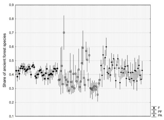 Share (mean ± 95% confidence interval based on 10 research plots of 100 m2) of ancient forest species in natural forests (F), manor parks adjacent to forests (PF), and manor parks not adjacent to forests (PA).