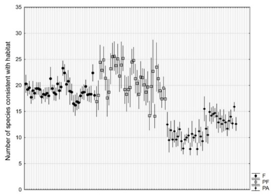 Number (mean ± 95% confidence interval based on 10 research plots of 100 m2) of plant species consistent with Tilio-Carpinetum habitat in natural forests (F), manor parks adjacent to forests (PF), and manor parks not adjacent to forests (PA).