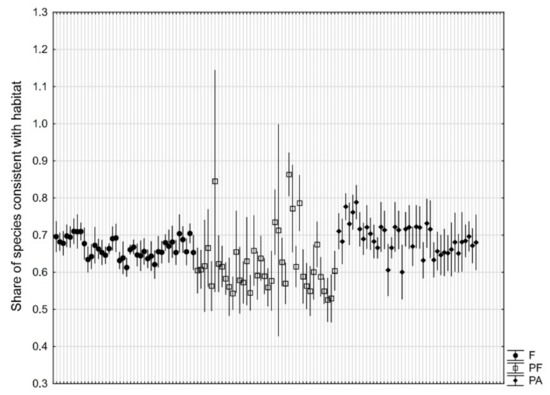Share (mean ± 95% confidence interval based on 10 research plots of 100 m2) of plant species consistent with Tilio-Carpinetum habitat in natural forests (F), manor parks adjacent to forests (PF), and manor parks not adjacent to forests (PA).