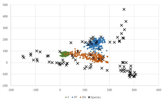 Ordination plot based on detrended correspondence analysis (DCA) of the species of the undergrowth layer and the plots (F: natural forests; PF: manor parks adjacent to forests; PA: manor parks not adjacent to forests).