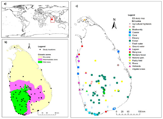Types and distribution of reviewed ecosystem service and biodiversity studies in Sri Lanka. (a) Location of Sri Lanka in the world map. (b) Study distribution according to the climatic zone (c) Study locations in relation to the ecosystem they were conducted.