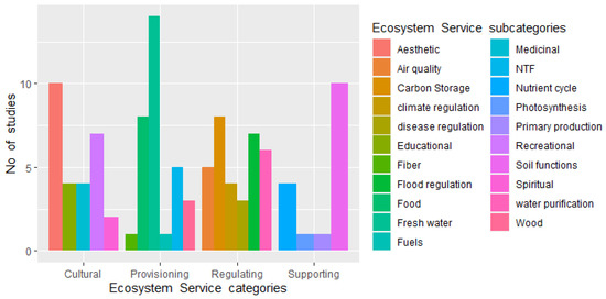 Ecosystem services evaluated among the reviewed studies conducted in Sri Lanka. The 21 types of ecosystem services identified in the studies are listed in the legend according to the definition of the Millennium Ecosystem Assessment [2] and in this graph we omit the studies related to biodiversity.