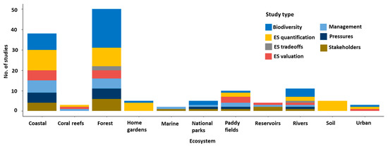 Analysis of different study types (Figure 4) for the identified ecosystem services and biodiversity studies for each considered ecosystem in Sri Lanka showed that for any given ecosystem the majority of the papers were biodiversity related (forest 38.7%, coastal 17.6%, national parks 40%) while the least common study type were pressure biodiversity studies (12.3% in total) while local knowledge and stakeholder involvement was recorded in 14.5% of studies, biophysical quantification in 17.7%, ecosystem trade-off in 1.4%, and ecosystem valuation studies were 12.7% in total.