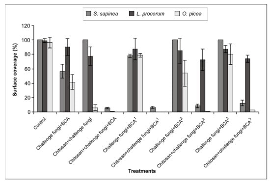 Unlike the two previous challenge fungi, the treatment of chitosan almost entirely inhibited the growth of O. piceae on the wafer surface; only 5–10% coverage was observed on the wafers treated with chitosan alone. When BCA alone was introduced at the same time as O. piceae on the untreated wafers, it significantly reduced the growth of O. piceae compared with the controls (p ≤ 0.05), but still allowed for about 50% coverage (Figure 1). However, like L. procerum, no melanisation was noticed on the BCA inoculated wafers; only synnemata growth was observed for O. piceae—mycelium masses were lacking. No growth of O. piceae was observed on the wafers treated with chitosan and inoculated with BCA at the same time or even after the delayed inoculation of BCA. However, when BCA was introduced on untreated wafers after a time delay, irrespective of whether it was 1, 2, or 3 days, more than 50% coverage of synnemata was observed on the wood wafers (Figure 1).