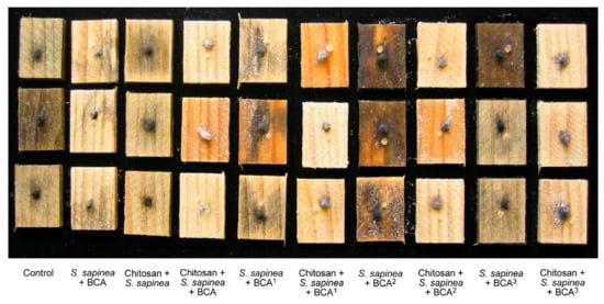 The quest for an alternative to toxic wood preservatives [] has prompted several investigations on biological control agents (BCAs). These investigations have included bacteria, such as Bacillus spp. and Pseudomonas spp., and fungi, such as Ophiostoma spp., Trichoderma spp., and Gliocladium spp. [,,,,]. However, the field performance of BCAs has not yet fully been proven as a satisfactory system [,,]. The inconsistent results imply either an inability to control some microbial strains or difficulties in growing the BCAs under commercial conditions on certain wood substrates or under specific environmental conditions []. For example, in a field test, CartapipTM, an albino strain of Ophiostoma piliferum, was successfully used to protect heat-treated Canadian softwoods; however, the results showed a poor reproducibility [,]. Yang and Rossignol [] evaluated Gliocladium roseum as an antagonistic fungus to sapstain. The treatment showed promising results as a potential biological agent for inhibiting sapstain in logs and green lumber, and a U.S. patent was granted []. However, its effectiveness is inconsistent in different wood species and the treatment is unable to protect pre-colonised wood. These previous studies suggest that the poor performance of BCAs in wood under natural conditions could be caused by a lack of a comprehensive competitive ability against other wood-degrading fungi. To improve the effectiveness of biological agents, one possible approach could be to combine a BCA with an environmentally friendly bioactive molecule, which acts in synergy with the BCA to provide an enhanced competitive advantage during fungal interactions [].