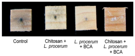 The present study was successful in identifying an integrated system for the protection of fresh wood against sapstain. The chitosan/BCA treatment system protected radiata pine sapwood wafers more effectively than the chitosan or BCA used alone. In this integrated approach, the concentration of chitosan used seemed to be delaying the growth of sapstain fungus, and this delay gave the BCA time to establish and grow normally on the wood. Once established, BCA deprived nutrients to the sapstain fungus and hence colonisation. Once established, as T. harzianum is a fast growing fungus, it penetrated deeply into the wood []. Our in-vitro study showed that T. harzianum is very tolerant against chitosan, while chitosan has a fungistatic effect against sapstain fungi, depending on the concentration used [,]. At a cellular level, it is possible that in the chitosan/T. harzianum combination, chitosan may be acting fungistatically to delay the growth of sapstain fungi by inducing morphological changes in the cell wall and cell membrane [], and the introduction of T. harzianum can degrade cell walls through the production of lytic enzymes []. Further work is needed to understand more clearly the mechanisms of the synergistic effects at a cellular level.