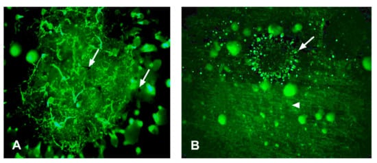 Stereo light micrographs showing the fluorescence of O. piceae on wood wafers: (A) Mycelium mass and well developed synnemata (arrows) over untreated wafers; (B) non pigmented synnemata of O. piceae fluorescing (arrow) on wafers inoculated with BCA. Mycelium of BCA (T. harzianum) auto-fluorescing (arrow-head).
