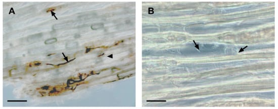 (A). Wood sections (270 µm from surface) taken from untreated, but BCA inoculated, wafers before S. sapinea inoculation. Arrows indicate melanised hyphae of S. sapinea. Bar = 20 µm. (B) Wood section (90–180 µm from surface) taken from wafers treated with BCA before inoculation with S. sapinea. Arrows indicate hyphae. Bar = 20 µm.