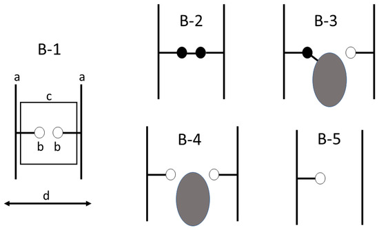 Model for chemical modification of wood at the cell wall polymer level (B-1) with (a) being cell wall polymer, (b) being hydroxyl on the polymer, (c) enclosing the area of interest, (d) representing radial and tangential swelling and shrinking The following are different cases with (B-1), untreated wood: small open circle represents OH group available for hydrogen bonding; (B-2) small filled circle, substitution of OH group with cross-link; (B-3) large filled circle being a bulking group bonded to the hydroxyl; (B-4) large filled circle representing unbonded bulking agent, and (B-5), showing a dehydrated polymer [2].