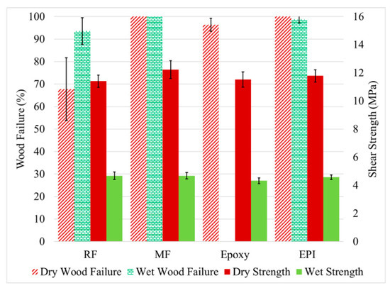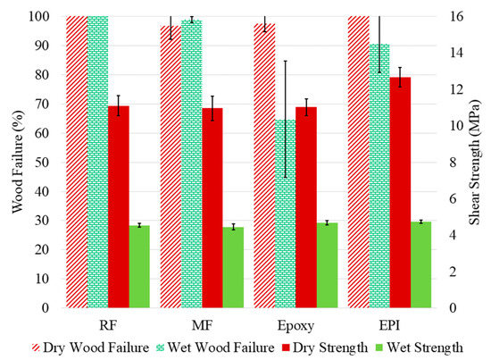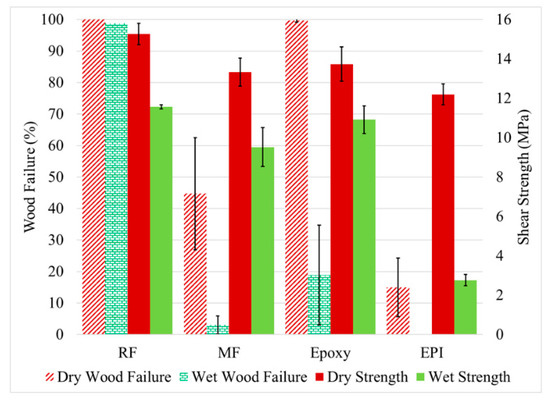 The measured shear strength (left axis) and wood failure (right axis) for the untreated yellow poplar bonded with RF (resorcinol formaldehyde), MF (melamine formaldehyde), epoxy, and EPI (emulsion polymer isocyanate adhesives. The samples were tested dry and after water soaking (wet). Error bars = 1 standard deviation.
