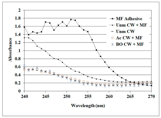 A startling prior observation was that the MF but not the RF was so poor in wood failure and bond strength with acetylated wood under wet conditions [19], which is supported by our observations. RF and MF both perform well with unmodified wood under both dry and wet conditions and are known to infiltrate the cell walls (i.e., cell wall penetration). Although we are not aware of a good method for measuring RF concentration in cell walls, a method has been developed to measure MF in cell walls using UV microscopy [31,40]. The analysis of these samples shows that MF has infiltrated the untreated wood cell walls near the glueline, but not the BO- or Ac-treated cell walls (Figure 8). While it is easy to jump to the conclusion that the poor wet shear strength and wood failure for the MF are a result of the failure to infiltrate the acetylated cell walls, it is contradicted by the good performance by the BO-modified wood results. Since the phenolics, including RF, are often highly basic, it could be postulated that this plays a role since MFs are acidic. However, this is not supported because the Casophen resorcinol–formaldehyde RS-216 had a pH 7.2. It may be that the phenolics are particularly effective at wetting acetylated wood, but insufficient data are available for drawing a firmer conclusion.