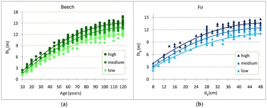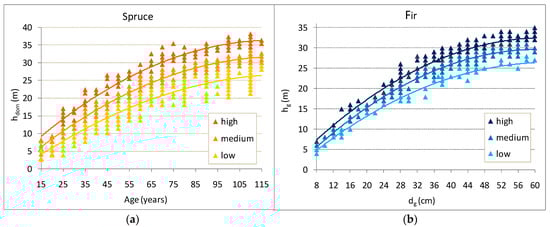 The dynamics of the height in relation to age were established according to model 1. The dominant height for spruce, fir, and beech is an expression of their site conditions (Table 3 and Figure 3) and was estimated using nine equations. In relation to age and to the average diameter of the stands, the average stands height can also describe the productivity of the sites. The relationships between these variables were established according to model 1 and estimated using nine equations for hg–T and nine equations for hg–dg. The height curves differ by species, capturing the peculiarities of the sites. They reflect the variation of the height of stands whose densities have a value around 0.8.