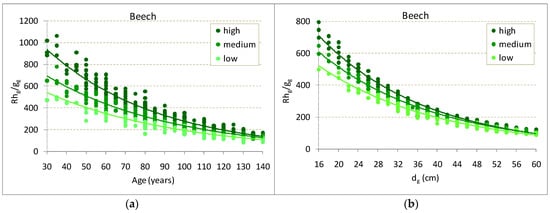 Rhgg expresses a close link between the intensity of stand growth and the site conditions. This indicator provides satisfactory results when the stands have reached an age of at least 30 years. For the estimation of this indicator, model 2 was used, represented by 18 regression equations (see the Table S1a,b from Supplementary Materials for all 18 equations). The Rhgg values explain 88% and 98% of the variation in age of the stands (between 30 and 140 years), and 93% and 98% of the average diameter (between 14 and 60 cm). For beech, R2 had values ranging between 0.91 and 0.98.