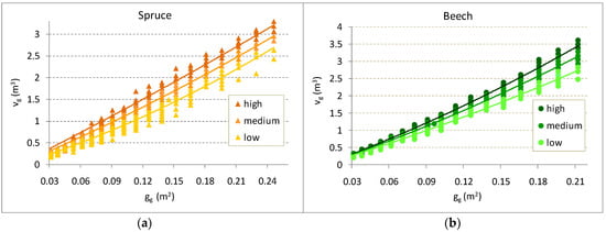 Relationship between mean tree volume (vg) and basal area (gg) in spruce (a) and beech (b).