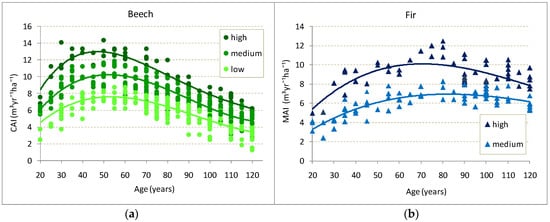 Current annual volume increment (CAI) for beech (a) and mean annual volume increment (MAI) for fir (b).