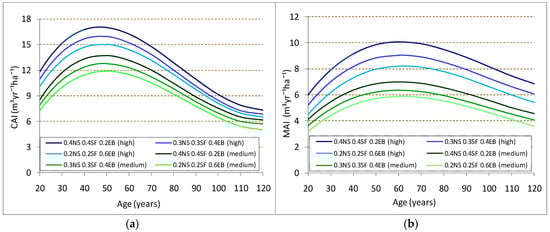 Current annual volume increment (CAI) (a) and mean annual volume increment (MAI) (b) for mixed stand with the following compositions 40%NS 40%SF 20%EB, 20%NS 20%SF 60%EB, 30%NS 30%SF 30%EB, located in medium–high productivity sites (NS–spruce, SF–fir, EB–beech)