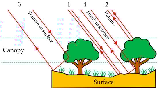 The characteristics of the observed object and sensor parameters, namely, the wavelengths, frequency, polarization of the transmitted and received signal, incidence angle, and direction of observation, determine the strength of the feedback signal (scattering) []; therefore, they must be taken into account when interpreting and analyzing the SAR data [,]. Researchers [,,,,,] have described the interaction of SAR impulses with forest and forestland. In this regard, the authors of [] describe the interaction of the forest and the L band, which consists of the following: (i) diffuse scattering from the forest floor, (ii) volume scattering from the forest canopy, (iii) scattering from the canopy signal to the soil and trunks, and (iv) specular reflection from the forest soil and trunks (Figure 1).