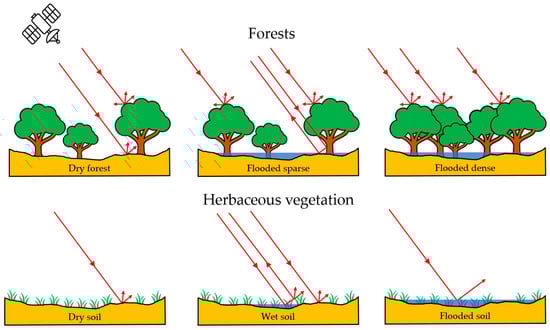 In particular, some authors are of the opinion that microwaves of shorter wavelengths (C and X bands) are not useful in mapping or monitoring forest floods [,,,,]. Namely, the main disadvantage of the C band in flood mapping under the forest canopy (Figure 2) is the attenuation of the signal from the canopy (leaves and needles) of trees or the insufficient wavelength [,]. On the other hand, studies have been published confirming the acceptability of C and X bands in flood detection under a forest canopy. In these papers, the authors describe the forest’s structural characteristics and seasonal predispositions in which the double-bounce phenomenon can be realized. In this sense, the author of [] affirmatively expresses the application of C bands in flood detection in forests and states that it is necessary to determine the stand structure and conditions under which floods can be detected using SAR C band VV sensors. In former research [], the author emphasizes that elements that attenuate the microwave signal as it passes through the forest canopy should be considered as well as those elements under the canopy that amplify rectangular backscattering. Using the ERS1 C band VV sensor, it was determined that a high stand basal area, greater heights from the bottom of the canopy, and openness of the layer under the canopy increase the backscattering in the flooded forests of the investigated area. Interestingly, the author did not determine a significant impact of the forest canopy (measured: leaf area index, crown closure, and canopy depth), which the author himself considers an unexpected result [].