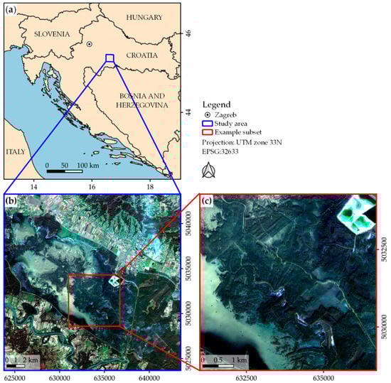 (a) Location of the study area; (b) study area with example subset location; (c) example subset for visual assessment (background: true-color composite of Sentinel-2 imagery; bands: B4-B3-B2, acquisition date: 5 January 2020).