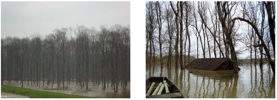 Floods are associated with high rainfall intensities and occur when recipients cannot receive all the water, causing them to spill over into the surrounding areas []. Flooded areas are land susceptible to being inundated by water from any source, which usually presents as low, frequently flooded habitats along the coast on river islands and reefs, usually in the river’s immediate vicinity depending on the micro-relief and in remote areas of the river valley []. About 9% of the land area of the Republic of Croatia (approximately 500,000 ha) can be described as a frequently flooded area, which means that there occurs at least one flooding event in a period of three to five years, and part of that area can be considered as wetland habitats []. Floodplain forests and rivers are an indivisible whole. In the floodplain, the appearance of forest stands (morphology) and the spatial distribution of wood biomass (structure) are particularly affected by the water regime and edaphic features. Any change in the water regime affects forest stands, especially their origin and dynamics. This impact can be direct (frequency, height and duration of floodwaters, and the occurrence of floodwater freezing) and indirect (spatial and temporal dynamics of soil moisture, groundwater, and precipitation) [].