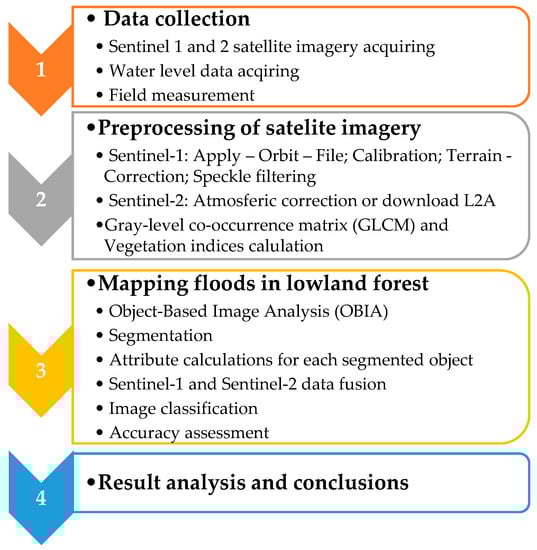 The impact of floods on forests is immediate, so it is necessary to quickly define the boundaries of flooded areas. Determining the extent of flooding in situ has shortcomings due to the possible limited spatial and temporal resolutions of data and the cost of data collection. Therefore, this research focused on flood mapping using geospatial data and remote sensing. The research area is located in the central part of the Republic of Croatia, an environmentally diverse area of lowland forests of the Sava River and its tributaries. Flood mapping was performed by merging Sentinel-1 (S1) and Sentinel-2 (S2) mission data and applying object-based image analysis (OBIA). For this purpose, synthetic aperture radar (SAR) data (GRD processing level) were primarily used during the flood period due to the possibility of all-day imaging in all weather conditions and flood detection under the density of canopy. The pre-flood S2 imagery, a summer acquisition, was used as a source of additional spectral data. Geographical information system (GIS) layers—a multisource forest inventory, habitat map, and flood hazard map—were used as additional sources of information in assessing the accuracy of and interpreting the obtained results. The spectral signature, geometric and textural features, and vegetation indices were applied in the OBIA process. The result of the work was a developed methodological framework with a high accuracy and speed of production. The overall accuracy of the classification is 94.94%. Based on the conducted research, the usefulness of the C band of the S1 in flood mapping in lowland forests in the leaf-off season was determined. The paper presents previous research and describes the SAR parameters and characteristics of floodplain forest with a significant impact on the accuracy of classification.
