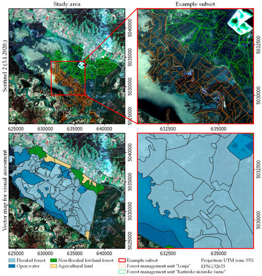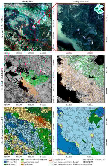 In the realization of the goal, by integrating S1 and S2 data, we attempted to use the advantages (data and information) of each sensor and increase the accuracy of classification by fusion, a synergy effect. On the other hand, it is necessary to accept, as stated in the review paper [], that vegetation in the low/moderate stage of growth is mainly considered separately in relation to high vegetation (e.g., forest) due to the different effects of vegetation structure and density on SAR signal intensities. Furthermore, the interpretation of the feedback SAR signal from different objects in the conditions of the existence or absence of flooding continues to be a research challenge [,]. Therefore, this paper selects and analyzes the environmentally diverse research area (grasslands, bushwood, agricultural land, and forests of different types and stages) to assess the applicability of Sentinel-1 (S1) and Sentinel-2 (S2) imagery in flood mapping in more complex (heterogeneous) environmental conditions.