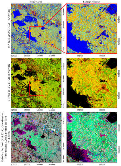 In the mapping of flooded forests using conventional (single-polarized) SAR systems, reference is made to using HH polarizations versus VV polarization [,,]. Namely, the rectangular reflection’s contribution (appearance) (double bounce) in the trunk–surface interaction is weaker in VV polarization. Dual SAR systems are useful for generating data and information from two polarizations ratios []. In general, the use of more advanced SAR systems and different polarization combinations opens up opportunities for obtaining new data (Table 1). Therefore, in the process of flood monitoring and mapping, the choice of the appropriate polarization is of paramount importance.