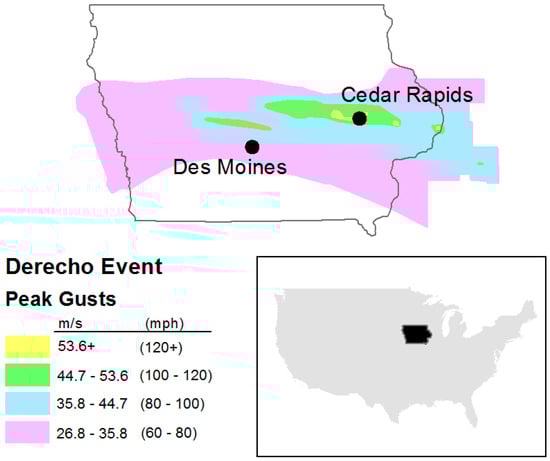 Estimated peak wind gusts of the Midwest Derecho, 10–11 August 2020, Iowa, USA. Data source: NOAA Storm Prediction Center.