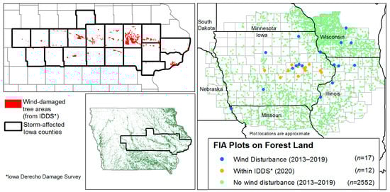 Iowa Derecho Damage Survey (IDDS) polygons within a 19-county area impacted by the 2020 Midwest Derecho (top left); NLCD2016 tree canopy cover in Iowa (bottom left); and FIA forest plots within a 221-county region, Iowa and adjacent states, USA (right). Plots were measured during 2013–2019 and depicted FIA plot locations are approximate.