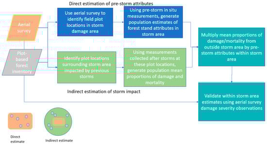 Estimation of storm impacts proceeded in two parts: direct estimation of pre-storm forest attributes within the IDDS damage polygons and indirect estimation of proportion of damage and mortality based on previous windstorms within the region surrounding the 19-county area (Figure 3). Estimates of storm impacts are then obtained by multiplying damage proportions by the pre-storm estimates. For example, if 2 million trees were present before the storm and the estimated damage proportion is 0.5, we would estimate 1 million damaged trees. Results were then validated against observed proportions of damaged trees from the aerial survey data. Additional details about each component of this process are described in the next three sub-sections. All estimates reported here are for forest land and do not include trees outside forests (e.g., windbreaks, shelterbelts, urban trees) [39].