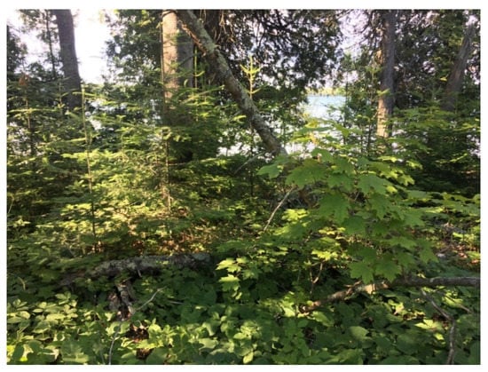 Note that trophic cascade effects vary in a mosaic pattern across the landscape, due to the locations of gray wolf (Canis lupus L.) packs. In areas with high wolf densities, deer populations are low and unhindered expansion of temperate tree species into adjacent boreal stands can occur, whereas in other areas with low wolf populations, deer populations are higher and prevent the establishment of temperate tree seedlings [31,32]. Deer densities can also interact with other factors to create complex responses of temperate and boreal tree species to changing climate [33,34].