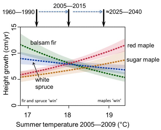 Height growth of understory saplings across a range of regional mean summer temperatures in ecotonal mixed temperate-boreal forest in northern Minnesota, USA. After [23].