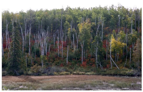 M5. Long, warm summers and increased drought stress. Much of the boreal forest lies adjacent to grasslands. The transition zone is coincident with a change in climate from one with a positive difference between precipitation and potential evapotranspiration (PPT minus PET > 0, which supports forest) to one where PPT minus PET is less than zero (which supports grasslands, [37,38,39]) that occurs over relatively short spatial distances of 10–100 km [40]. Warming-exacerbated declines in soil moisture are likely to negatively impact tree photosynthesis in this region. In addition, drier soils can also flip the response of photosynthesis to modestly higher temperatures from positive to negative [41]. This results in drier soils from heightened stomatal closure in response to warming outweighing increasing biochemical capacity for photosynthesis; whereas the latter dominates in moist soils. Therefore, a pronounced shift in the zero balance line for precipitation and evaporation could lead to widespread forest death, especially during a run of several unusually warm and dry years that could occur decades before the mean climate shifts to one that favors grasslands. Runs of several warm dry years have already led to mortality and slowed growth of several boreal species [42,43,44] (Figure 6), and conversion from boreal forest to grassland/savanna in some parts of Canada [8]. This trend is predicted to continue during the 21st Century [45,46]. However, the drying of the climate could also lead to conversion from boreal forest to drought-tolerant temperate tree species. Bur oak, northern pin oak, and northern red oak are already present near the southern boreal forest on dry sites, and white oak (Quercus alba L.) and black oak (Q. velutina Lambert) could migrate there [47]. Due to the high landscape diversity of the Canadian Shield that underlies northern Minnesota, Ontario and Manitoba, with soils of greatly varying water holding capacity, a mosaic of grassland, savanna and woodland could form [7,10,12]. Transformation of boreal forests could be gradual (with gradually increasing drought stress) or moderately sudden (with a run of several hot, dry years) [38].