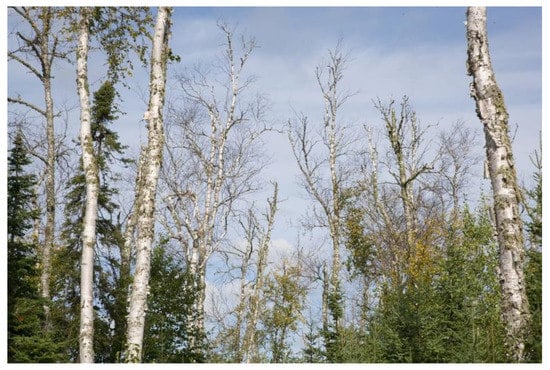 - Jones, E.A.; Reed, D.D.; Mroz, G.D.; Leichty, H.O.; Cattelino, P.J. Climate stress as a precursor to forest decline: Paper birch in northern Michigan, 1985–1990. Can. J. For. Res. 1993, 23, 229–233. [Google Scholar] [CrossRef]